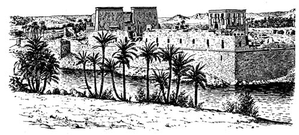 Саисское искусство имело существенное значение для последующего развития египетского искусства, которое еще далеко не исчерпало себя. Несмотря на тяжелые последствия персидского завоевания (525 г. до н.э.),в недолгий период борьбы Египта за независимость (5 в. до н.э.) египетские художники создали еще ряд прекрасных памятников, продолжая оба направления саисского искусства. Лучшим образцом реалистического портрета этого времени является известная голова жреца из зеленого камня (илл. 99 6), замечательная резко подчеркнутой характеристикой властного и сурового человеческого лица в духе портретов Среднего царства. После вторичного завоевания персами, а затем греко-македонцами в 332 г. до н.э. Египет, сохранив политическую самостоятельность под управлением эллинистической династии Птолемеев, нашел силы для нового подъема искусства, — правда, повторявшего старые образцы в форме очень сухой и утонченно-манерной. В это время были построены храмы в Эдфу, Эсне, Дендера, на острове Филэ (см.рисунок). Однако памятники этого периода целесообразнее рассматривать в контексте эллинистического искусства.