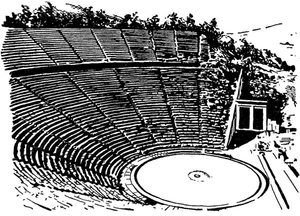 К середине. 4 в. до н.э. относится ансамбль святилища Асклепия в Эпидавре, центром которого был храм бога-врачевателя Асклепия, но самым замечательным зданием ансамбля был построенный Поликлетом Младшим театр, один из красивейших театров древности (илл. 221). В нем, как и в большинстве театров того времени, места для зрителей (театрон) располагались по склону холма. Всего было 52 ряда каменных скамей, которые вмещали не менее 10 тыс. человек. Эти ряды обрамляли орхестру — площадку, на которой выступал хор. Концентрическими рядами театрон охватывал более полуокружности орхестры. Со стороны, противоположной местам для зрителей, орхестра замыкалась скеной, или в переводе с греческого — палаткой. Первоначально, в 6 и начале 5 в. до н.э., скена и была палаткой, в которой готовились к выходу актеры, но уже к концу 5 в. до н.э. скена превратилась в сложное двухъярусное сооружение, украшенное колоннами и образующее архитектурный фон, перед которым выступали актеры. Из внутренних помещений скены на орхестру вело несколько выходов. Скена в Эпидавре имела украшенный ионическим ордером просцениум — каменную площадку, поднимавшуюся над уровнем орхестры и предназначенную для проведения отдельных игровых эпизодов главными актерами. Театр в Эпидавре был с исключительным художественным чутьем вписан в силуэт пологого склона холма. Скена, торжественная и изящная по своей архитектуре, освещенная солнцем, красиво вырисовывалась на фоне синего неба и далеких контуров гор и в то же время выделяла из окружающей природной среды актеров и хор драмы.