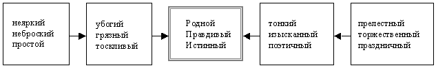 Это уже не просто вербализация зрительного впечатления (в том числе и через указание на цвет), а поэтическая интерпретация - эстетически завершенная "картина" переживаемого, "замена видимого истинным" [9. С.54]. Всё в этом отрывке (лексика, грамматика, образный элемент) определяет и углубляет оценочное значение слова "серый". Лексически оно сближается со словами "простой" (скромный, безыскусный), "тусклый" (неяркий, неброский), но "торжественно-праздничный" (возвышенный) - "чудный" (удивительный по прелести и красоте, великолепный). На грамматическом уровне это использование привычной для автора конструкции противопоставления и формы превосходной степени эмоционально-оценочного прилагательного, выступающего в роли предиката. Образность обеспечивается двойным сравнением, содержащим метафоры: пасхальное пение "струится", как струится, наверное, мистический серый дымок и запах ладана. Такими простыми и убедительными средствами А.Н. Бенуа передает запечатленный в живописи "чарующий ужас сверхъестественного", благоговение - "чисто русское настроение".