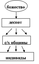 Земля в данных обществах не рассматривается как собственность общины. Ее действительным собственником является высшее божественное начало. Далее, объединяющее единое начало реализуется в деспоте, как отце множества общин. А община, получив землю во владение от деспота уже предоставляет надел земли отдельному человеку - члену своей общины.