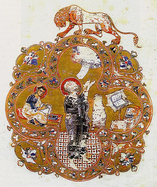 Напрестольное Евангелие Софийского кафедрального собора в Новгороде. Текст записан диаконом Георгием по заказу новгородского посадника Остромира, родственника киевского князя Изяслава – сына святого Ярослава Мудрого. В Евангелии сохранились три миниатюры: святых евангелистов Иоанна Богослова, Луки и Марка [7, с.262-263]. Миниатюры с евангелистом Матфеем не сохранилось. Одно из самых замечательных произведений искусства Киевской Руси, богато украшенное, наследующее византийскую манеру письма XI века.