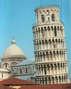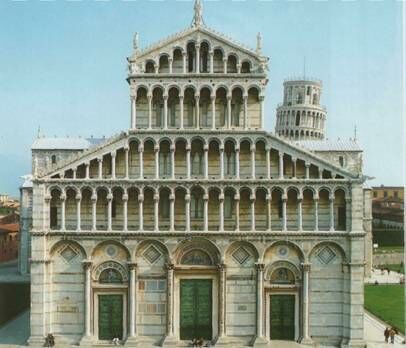 В фасаде собора выделяются пять ордеров, нижний из которых составлен из семи арочных ниш. Арки опираются на пилястры и колонны с капителями коринфского ордена. Арочные ниши украшают круглые окна с многоцветной инкрустацией. Падающая башня была построена как колокольня собора. По мнению исследователей, причиной наклонения башни является неравномерная осадка аллювиальной почвы. Высота башни – ок.56 метров, наибольшее отклонение от вертикали – 4,54 м со среднем углублением основания в землю 2,25 м. Наклонение башни продолжается увеличиваться из года в год в среднем на один мм. Строительство башни начали в 1173 г. Первым архитектором являлся Джерардо ди Джерардо. Через пять лет вынуждены были остановить постройку на третьем этаже из- за осадки грунта. В период 1275по 1284 гг. ди Симоние воздвиг еще три этажа, пока наклонение не заставило его остановить работы. После нового перерыва ок. 70 лет, в 1350-1356 гг. постройку башни закончил Томмазо Пизано, который построил звонницу, где были установлены семь колоколов. Романский стиль в Англии господствовал в конце XI-XII вв. Его специфической особенностью было соединение в здании типов монастырского и приходского храмов. Английские храмы хотя и весьма сходны с французскими, но имеют большую протяженность и вытянутость в длину (170 м). Излюбленным элементом английской архитектуры были башни.