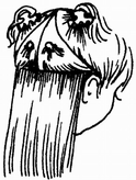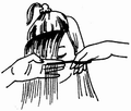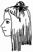 Расчесать волосы от макушки вниз во все стороны, и разделить волосы центральным вертикальным пробором. Затем отделить волосы затылочной части горизонтальным пробором.