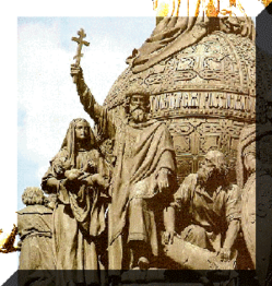 Справа от Рюрика расположена группа киевского князя Владимира, изображающая крещение Руси, то есть принятие христианства, что объективно способствовало приобщению славян к высокой греческой культуре, было шагом вперед по сравнению с языческими верованиями. Владимир стоит в центре композиции с поднятым вверх восьмиконечным крестом; перед ним славянин, низвергающий статую языческого божества, сзади женщина, протягивающая князю ребенка, Образ князя Владимира, героя былинного эпоса, решен совершенно иначе, чем Рюрика. Там мы видим пылкого и смелого воина - здесь перед нами величавый и умудренный жизнью правитель. Черты его лица покойны, движения сдержанны, но сколько сил, сколько решимости в жесте правой руки, держащей крест! Мрачные и кровавые языческие идолы будут сброшены в Днепр, а на месте идолова копища вознесется златоглавая Киевская София - и нет иного пути для молодого государства. Драматическая напряженность ситуации хорошо выражена в двух других фигурах группы: в движении славянина заметна какая-то неуверенность, его взгляд обращен на Владимира, так, словно он черпает недостающую решимость в решимости князя. И напротив, для женщины, прямо и спокойно стоящей с младенцем, уже нет сомнений в избранном пути, нет неуверенности и колебаний, она понимает Владимира и верит ему.