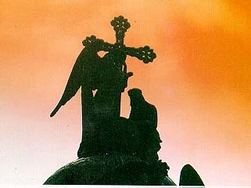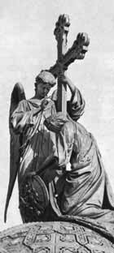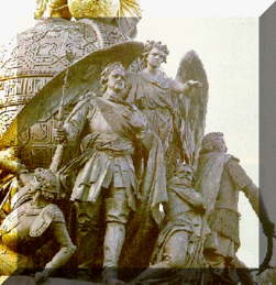 |   В верхней части памятника расположена скульптурная группа: ангел, держащий крест, и склоненная перед ним женщина, символизирующая Россию. Эти скульптуры выполнил непосредственно Михаил Осипович Микешин вместе с Иваном Шредером.  |  |