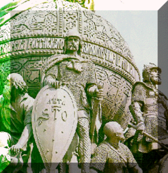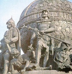 На юго-восточную сторону, в направлении Москвы обращена группа Дмитрия Донского. Фигура самого князя выполнена очень сильно: перед нами классический образ полководца, ведущего войско в битву. Но это не только военачальник. Мы узнаем в нем того, кто перед решающим сражением снял г, себя княжеское облачение и бился в рядах московской дружины в доспехах простого воина. Дмитрий представлен на памятнике как образ полководца-витязя, победителя на Куликовом поле. Дмитрий ногой попирает поверженного татарского мурзу; кажется, он только что сразил его шестопером, который крепко держит в правой руке. Татарский воин жив, он поднимается, хоть в движениях его нет ни силы, ни страсти. Но Дмитрий уже не обращает внимания на побежденного врага - он смотрит за пыльный горизонт, куда бежит разбитая армия Мамая. Сражения еще предстоят, и князь готов к ним. Группа эта являет собой чрезвычайно выразительный символ победоносного выступления Руси против ненавистного чужеземного ига.