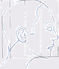 Размер головы в профиль также состоит из трех с половиной отрезков, которые соответствуют затылку, расположению ушей, основанию шеи и кончику носа. Горизонтальные вспомогательные линии не отличаются от вертикальных.