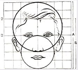В соответствии с каноном изображения головы человека, ее размер равен трем с половиной отрезом, равным высоте лба. Первая линия отмечает расположение волос, вторая - глаз, третья - носа и подбородка.