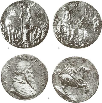 Рис. 1. Бронзовые медали эпохи Ренессанса: а, б — работа Пизанелло (1395-1455 гг.); в — аверс и реверс медали работы Б. Челлини (1500-1571 гг.)
