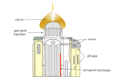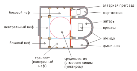 В классическом крестово-купольном храме квадратное в плане здание делилось рядами столбов или колонн на нефы - межрядовые пространства, идущие от входа к алтарю. Нефов, как правило, было 3, 5 или 7, причем ширина центрального нефа вдвое превышала ширину боковых. Точно по центру здания в центральном нефе симметрично располагались четыре главных столба, несущих купол. Эти столбы выделяли в пространстве храма еще один неф - поперечный или трансепт. Квадратное подкупольное пространство между главными столбами, являющееся пересечением центрального нефа и трансепта, называется средокрестием. Со столбов на стены перекидывались арки, несущие полуцилиндрические (бочковые) своды. На четыре главных столба опирался барабан со световыми окнами, поддерживающий главный купол храма. С центральным куполом могли соседствовать от 4 до 12 меньших куполов (главный купол символизирует Христа, 5 куполов - Христа с евангелистами, 13 куполов - Христа с апостолами).