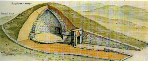 Если в ХVI в. до н. э. такие сокровища отправляли в захоронения – грубые земляные шахты, то в ХIV в. до н. э. в тех же Микенах были построены величественные толосы – круглые в плане купольные гробницы. Купол был украшен серебряными золочёными розетками, имитирующими небесный свод. К гробнице вели длинный узкий коридор - дромос и высокий, красиво оформленный портал, полуколонны которого были богато расписаны длинными зигзагами. Выше колонн шёл аттик – стенка над венчающим сооружение карнизом, на которой изображена сцена поимки дикого быка. Перед этим порталом были найдены фрагменты разбитых чаш, видимо оставшихся от тризны – поминального пиршества. Внутри, справа от входа, перекрытого огромным, «циклопическим» камнем, была устроена отдельная погребальная камера. Она некогда тоже могла быть богато украшена, как показали раскопки гробницы в Орхомене (Беотия, область в Центральной Греции), выполненные Генрихом Шлиманом. Там был найден фрагмент потолка со схематичным – в бегущих спиралях и стрелах – изображением звёздного неба. Найденные гробницы оказались совершенно пустыми.