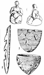 Неолит: 1 – женские статуэтки из глины; 2 – гарпун из рога; 3 – глиняная посуда с ямочным орнаментом.