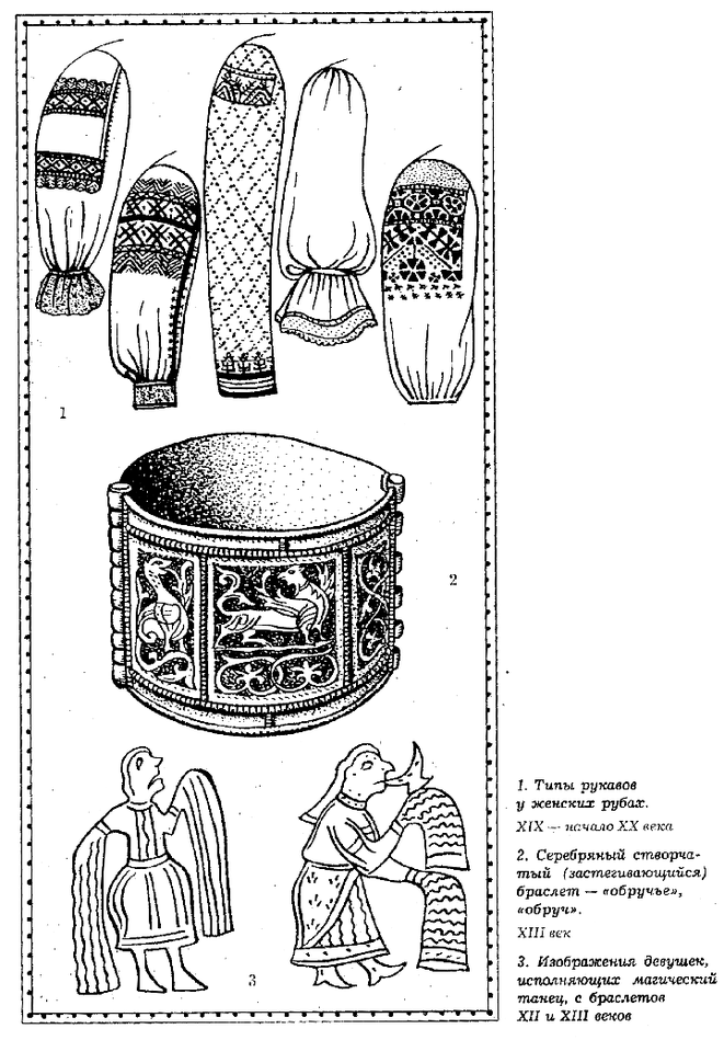 В праздничных женских рубахах тесёмки на рукавах заменялись створчатыми (застёгивающимися) браслетами — «обручьями», «обручами». Рукава подобных рубах были много длиннее руки, в распущенном виде они достигали земли. А поскольку у древних славян все праздники носили религиозный характер, нарядные одежды надевались не только для красоты — это были одновременно и ритуальные облачения. Браслет XII века (сделанный, кстати, как раз для такого праздника-священнодействия) сохранил для нас изображение девушки, исполняющей магический танец. Длинные волосы её разметались, руки в спущенных рукавах взлетают, как лебединые крылья. Учёные думают, что это танец дев-птиц, приносящих земле плодородие. Южные славяне называют их «вилами», у некоторых западноевропейских народов они превратились в «вилис», в древнерусской мифологии к ним близки русалки. Все помнят волшебные сказки о девушках-птицах: герой, случается, похищает у них чудесные наряды. А также сказку о Царевне-лягушке: помавание спущенным рукавом играет в ней не последнюю роль. Вот уж действительно, сказка — ложь, да в ней намёк. В данном случае — намёк на ритуальную женскую одежду языческих времён, на одежду для священнодействия и колдовства.