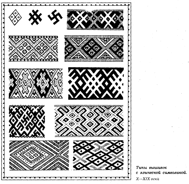 По мнению древних, следовало так или иначе «обезопасить» все необходимые отверстия, имевшиеся в готовой одежде: ворот, подол, рукава. Оберегом здесь служила вышивка, содержавшая всевозможные священные изображения и магические символы. Языческий смысл народных вышивок очень хорошо прослеживается с древнейших образцов до вполне современных работ, недаром учёные считают вышивку важным источником в изучении древней религии. Эта тема поистине необъятна, ей посвящено огромное количество научных трудов.