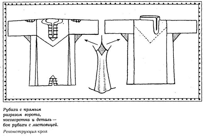 Рубаха, непосредственно прилегавшая к телу, шилась с бесконечными магическими предосторожностями, ведь она должна была не только согревать, но и отгонять силы зла, а душу — удерживать в теле. Так, когда кроили ворот, вырезанный лоскут непременно протаскивали внутрь