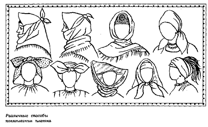 В холодное время года женщины всех возрастов покрывали голову тёплым платком. Только завязывался он не под подбородком, как мы привыкли. Такой способ, как пишут учёные, сравнительно недавно проник в Россию из Германии через Польшу. В древности платок охватывал подбородок и шею, а узел завязывали высоко на макушке. Такая манера носить платок сохранилась кое-где в России еще в начале XX века. «Не следует думать, что у этих женщин болят зубы», — комментирует свой документальный рисунок этнограф.