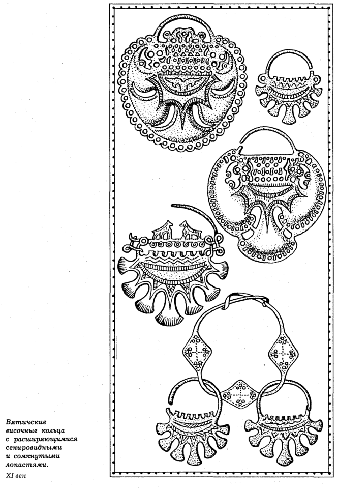 Между тем к востоку от радимичских территорий жило племя вятичей, тоже славившееся искусными кузнецами. Судя по всему, им особенно приглянулись кольца, зубцы которых были увенчаны одной или не- сколькими серебряными «капельками». В течение всего IX века в их руках эти «капельки» меняли размеры и форму, постепенно превращаясь в плоские расширяющиеся лопасти. И к XI веку на обширных пространствах от современного города Орла до Рязани, в окрестностях будущей Москвы женщины носили своеобразные височные кольца, которые археологи так и называют «вятичскими». Их лопасти, округлые поначалу, постепенно становятся «секировидными», затем и вовсе начинают смыкаться. Замечено, что вятичские кольца очень нравились в других племенах. Например, на соседней территории кривичей они найдены вперемешку с местными образцами и даже продетыми в кривичское щитковое кольцо. Что, если их носила женщина, чей муж был из вятичей? А может быть, она купила их или приняла в подарок? Нам об этом остаётся только гадать...