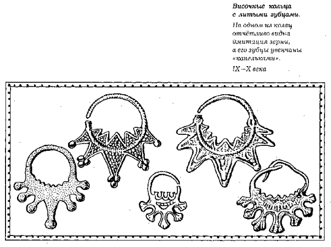 А вот пример того, какой своеобразный колорит приобретала в руках славянских мастеров любая «общеевропейская» вещь. Полторы тысячи лет назад по всей Западной Европе до самой Скандинавии распространилась из Византии мода на драгоценные подвески, представлявшие собой незамкнутые кольца, украшенные несколькими гроздьями зерни. Носили их и западные славяне. Кузнецы племени радимичей, к которым подобные кольца нет-нет да и попадали от соседей, не просто скопировали образец. Гроздья драгоценной зерни они заменили литыми зубцами, украшенными имитацией зерни. Быть может, им что-то подсказал узор, на миг возникающий, когда разлетается капля воды? Или это сияние, расходящиеся лучи?.. Трудно сказать. Однако после замены зерни литьём украшение, которое прежде могли позволить себе только хозяйки богатых домов, сделалось общедоступным. Уже в VIII—IX веках оно стало характерной принадлежностью радимичского племенного наряда.