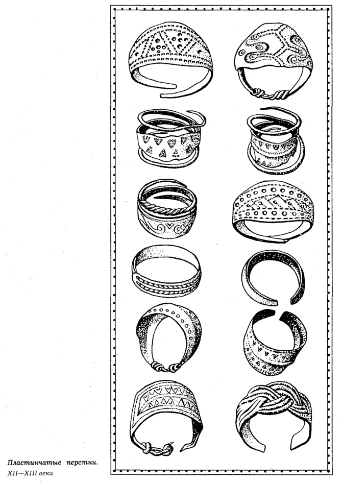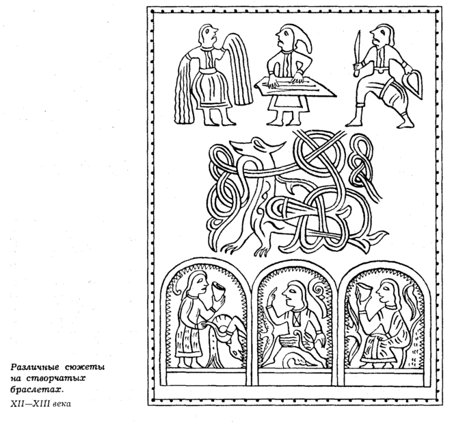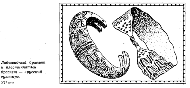 Очень красивы и разнообразны «пластинчатые» (согнутые из пластинок металла) браслеты, кованые и литые. Мода на некоторые из них приходила не из Византии, а, наоборот, из Северных стран. Например, широкие, массивные, выпуклые, литые, с характерным рисунком браслеты часто находят в Скандинавии, Финляндии, Карелии. Учёные называют их «ладьевидными». Нередко они даже застёгивались замочком, укреплённым на миниатюрных шарнирах. Славянским мастерам, жившим на территории современной Владимирской области, как видно, понравился чужеземный рисунок-змейка. Однако сам браслет они сделали на свой лад, из тонкой плоской пластины с завязанными концами, а узор нанесли в технике тиснения (с помощью штампа), которой не применяли северные кузнецы. В таком виде, уже в качестве «русского сувенира», эти браслеты попадают опять в Скандинавию — пластинчатые, да к тому же завязанные по-славянски, были там редкостью...