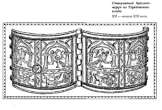 С домонгольских времён сохранились браслеты ещё одной разновидности — «створчатые», состоящие из двух половинок, соединённых маленькими петлями и застёжкой. На дошедших до нас образцах различимы изображения мифических животных, птиц и музыкантов, играющих на гуслях и