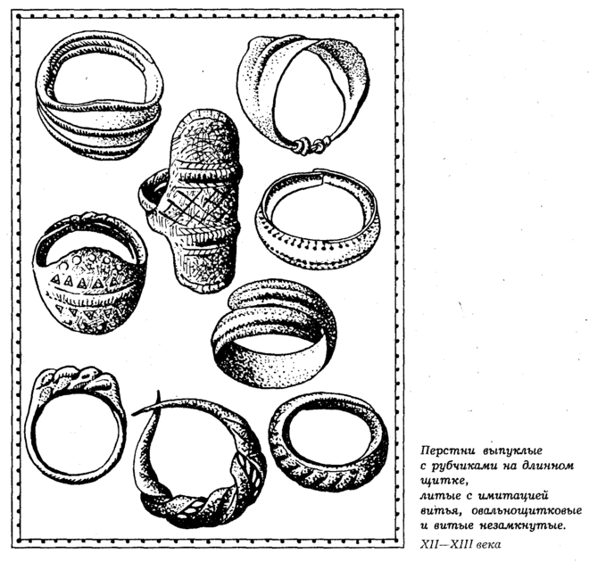 Очень своеобразные и красивые «решётчатые» перстни вятичей были, по-видимому, навеяны искусством мордовских и муромских финно-угорских племен. Вятичи вообще очень долго сохраняли свой колорит, не торопясь растворяться в крепнувшем древнерусском государстве. Мастера, жившие в разных концах территории вятичей, наносили один и тот же узор и на височные кольца, и на перстни с разомкнутыми концами и широкими серединками — их отливали в виде пластинок и лишь потом сгибали в кольцо. Фон рельефного узора при этом иногда заполняли эмалью. У вятичей такие перстни носили не только знатные люди, но и простой народ, живший по лесным деревням. Да и делали их как в городе, так и в сельских мастерских.