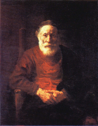 Мы не знаем имени человека, послужившего моделью для портрета «Старик в красном». Рембрандт писал его дважды: в портрете 1652 года (Национальная галерея, Лондон) он изображен сидящим в кресле с подлокотниками, в глубокой задумчивости склонившим голову на правую руку; эрмитажный вариант трактует ту же тему— человек наедине со своими думами. На этот раз художник применяет строго симметричную композицию, изображая неподвижно сидящего старика в фас. Но тем заметнее движение мысли, едва уловимая смена выражения лица: оно кажется то суровым, то более мягким, то усталым, то вдруг озаренным приливом внутренней силы и энергии. То же происходит и с руками: они кажутся то судорожно сжатыми, то лежащими обессиленно. Художник достигает этого прежде всего благодаря блестящему мастерству светотени, которая в зависимости от ее силы и контрастности вносит в изображение элегическую расслабленность или драматическое напряжение. Огромную роль играет при этом и манера нанесения краски на холст. Изрытое морщинами лицо старика и узловатые натруженные руки обретают художественную, выразительность благодаря вязкому месиву красок, в котором переплетающиеся жирные мазки передают структуру формы, а тонкие лессировки придают ей движение и жизнь.
