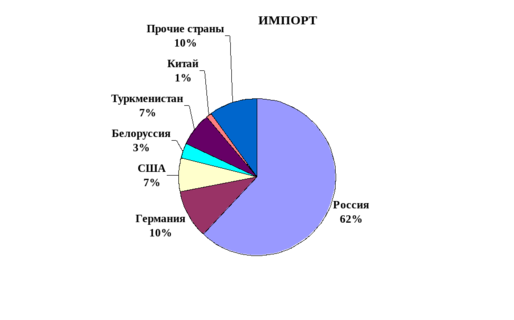 Ведущими импортерами для Украины остались Россия 62% общих объемов импорта, Германия 10%, США 7%, Белоруссия 3%, Туркменистан 7%, Китай 1%, на долю прочих стран приходится 10%.