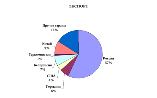 Основные экспортные поставки товаров и услуг осуществлялись в страны Европы(20,5% общих объемов экспорта продукции в страны дальнего зарубежья) и Азии(18,6%).В значительных объемах товары экспортировались в Китай($383,6 млн., или12,7% общих объемов экспорта в страны дальнего зарубежья), в Германию $200,9 млн. (6,7%), в Турцию $195,3 млн. (6,5%), а также в Польшу $173,5 млн. (5,8%).