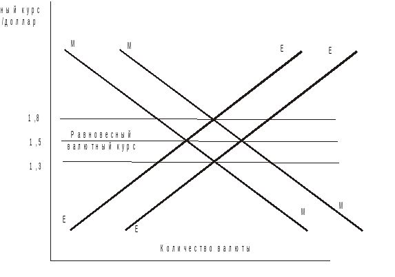 Предположим, что на рынок иностранной валюты выходят немецкие импортеры и экспортеры, ведущие торговлю с США. Кривая спроса на доллары (ММ) имеет отрицательный наклон: чем выше курс доллара, (соответственно ниже курс марки), то есть чем больше марок стоит один доллар, тем меньше спрос на доллары со стороны импортеров, поскольку американские товары становятся дороже для немцев. Компьютер в 1 тыс. долл. обойдется немцу в 2 тыс. марок при курсе 2 марки за доллар (1000 х 2) и только 1,5 тыс. марок при курсе 1,5 марки за доллар (1000 х 1,5). Кривая предложения долларов (ЕЕ) имеет положительный наклон: чем выше курс доллара (соответственно ниже курс марки), тем больше спрос на немецкие товары, так как они становятся дешевле для иностранцев. При курсе 1,5 марки за доллар машина ценой 30 тыс. марок будет стоить американцу 20 тыс. долл., а при курсе 2 марки за доллар 15 тыс. долл. Следует заметить, что кривые ММ и ЕЕ строятся для заданных уровней цен и постоянных объемах совокупного спроса в обеих странах.