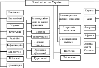 Зовнішньоекономічна діяльність країни полягає у встановленні зовнішніх зв’язків держави з іншими країнами та міжнародними організаціями – партнерами міжнародної діяльності. Зовнішні зв’язки держави - це взаємообмін з країнами світу продуктами матеріального виробництва, послугами, інформацією на основі міжнародного поділу праці, а також співдружність політичних органів, направлене на ефективне рішення глобальних проблем людства, розширення особистих проблем громадян. Такі зв’язки України можуть бути представлені наступною схемою: