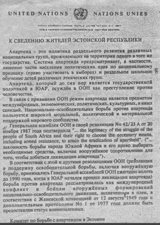 В Конституции Эстонской Республики принятой в 1992 году, в статье 3. мы находим обнадёживающий тезис: «Общепризнанные принципы и нормы международного права являются неотъемлемой частью правовой системы Эстонии». На словах Эстонская Республика широко поддержала Всеобщую Конвенцию по правам человека, однако в 1994 году имел место любопытный факт, когда общественность была взбудоражена листовкой, гулявшей по почтовым ящикам, подписанной неким Комитетом по борьбе с апартеидом в Эстонии. (См. выше.)