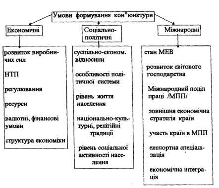Умови формування кон’юнктури (УФК) - це зовнішнє середовище відносно КФФ, яке здатне впливати на КФФ. УФК можна поділити на три групи: економічні, соціально-політичні та міжнародні.
