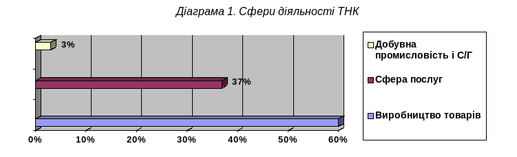 В останні роки активно розвивають свою діяльність на світовому ринку транснаціональні корпорації нових індустріальних країн. Галузева структура ТНК достатньо широка. 60% міжнародних компаній зайняті в сфері виробництва (насамперед вони спеціалізуються на електроніці, автомобілебудуванні, хімічній і фармацевтичній промисловості), 37% - у сфері послуг і 3% - у видобувній промисловості і сільському господарстві (див. діаграму 1).