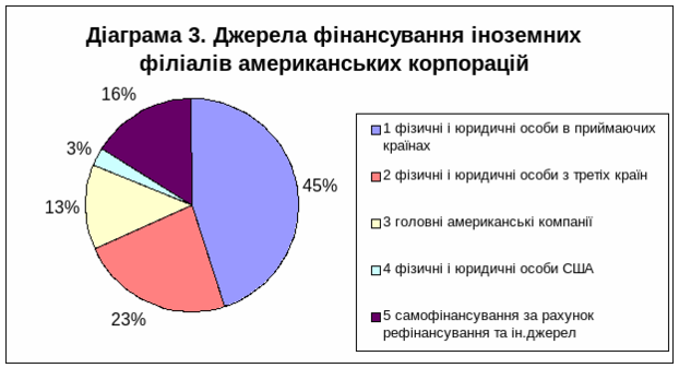 Джерелами їх фінансування виступають не стільки головні американські компанії, скільки фізичні і юридичні особи з третіх країн, що приймають, (див. діаграма 3). Для цього іноземні філії ТНК широко використовують позики комерційних і фінансових інститутів держави , що приймає , і третіх країн, а не тільки країн базування материнської компанії; постійна проінформованість про кон'юнктуру в товарних, валютних і фінансових ринків у різних країнах; раціональна організаційна структура , що знаходиться під пильною увагою керівництва ТНК, постійно удосконалюється; досвід міжнародного менеджменту, включаючи оптимальну організацію виробництва і збуту, підтримка високої репутації фірми.1
