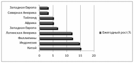 В разных странах изменения в розничной торговле молочными продуктами характеризуются совершенно разными темпами в связи с ростом доходов и увеличением городского населения. Пропаганда через СМИ, а также появление новых видов каналов реализации способствуют росту продаж в странах, где молочные продукты только-только начинают находить своих потребителей. Например, в Китае потребление молочных продуктов растет со скоростью 15% в год. Сети супермаркетов помогают ускорить этот рост потребления, предоставляя потребителям доступ к широкому выбору продуктов и брендов. Правительство страны способствует изменению структуры спроса, пропагандируя потребления молока в школах как средство для улучшения рациона детского питания. На других растущих рынках развивающихся стран рост рынка молочных продуктов составляет более 10% в год (рис. 2).