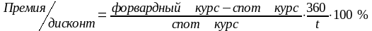 Форвардный валютный контракт – обязательное для исполнения соглашение о покупке или продаже в определенный день в будущем определенной суммы иностранной валюты. Валюта, сумма, курс и дата платежа фиксируются в момент заключения сделки. Срок сделок: от трех дней до пяти лет. Наиболее распространенные сделки на срок 1, 3, 6 ,12 месяцев. Теоретически форвардная цена валюты может быть равна спот цене, но на практике это встречается редко. Если форвардный курс больше спот курса, валюта котируется с премией, если меньше, то с дисконтом. Размер дисконтов или премий вычисляется по формуле: