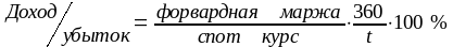 Если валюта котируется с премией, то своп принесет доход. Если валюта котируется с дисконтом, то своп будет убыточным. Доходность (убыточность) свопа в виде годовой процентной ставки определяется по формуле: