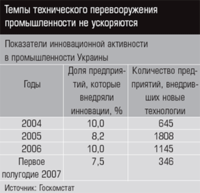 В 2007 г. работы по созданию и использованию объектов права интеллектуальной собствеенности (изобретений, полезных моделей, промышленных обрзцов и рационализаторских предложений) производили 1316 предприятий и организаций Украины – юридических лиц. Треть из них составили предприятия перерабатывающей промышленности, почти половина из которых – 47% – предприятия машиностроения. Госкомстат Украины даёт такие показатели инновационной активности за 2007 г. (табл. 2):