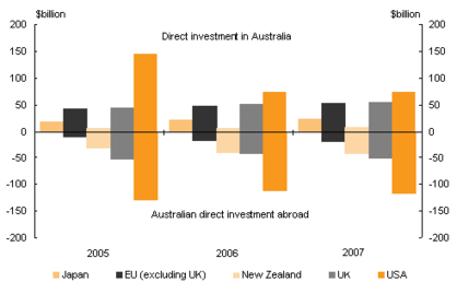 Діаграма 1 зображає недавні тенденції в FDI потоки між Австралією і її п'ятьма найбільш важливими партнерами FDI: США, Сполучене Королівство (Великобританія), Японія, Нова Зеландія і Євросоюз (ЄС) (окрім Великобританії). США- австралійське єдине найбільше джерело внутрішнього FDI і найголовніше місце призначення для Австралійського FDI за кордоном. Майже чверть всього FDI в Австралію прибуває з США і приблизно 40 відсотка всіх Австралійських прямих інвестицій за кордоном витікає в США. У 31 грудні 2007, Австралія мала на $42.7 мільярдів більше прямих інвестиції в США, ніж США мали в Австралії. Великобританія традиційно була австралійським головним джерелом FDI. В кінці 2007, $54.0 мільярдів, або приблизно 17 відсотків FDI в Австралії походили з Великобританії. Рівень австралійських прямих інвестицій в Великобританію ріс стрімко в 2007 до $53.5 мільярдів. Рівень Японського FDI в Австралії в 2007 склав $23.5 мільярдів. Проте, Австралійський FDI в Японію був на дуже низькому рівні. Рівень Австралійських прямих інвестицій до Нової Зеландії зріс в 2007 до $41.1 мільярдів. Нові зеландські прямі інвестиції до Австралії зросли до $7.9 мільярдів в 2007. Рівень прямих інвестицій ЄС (виключення Великобританія) в Австралійську економіку зріс в 2007 до $53.1 мільярдів. Австралійські прямі інвестиції в ЄС майже подвоїлись за останні два роки до $20.2 мільярдів в кінці 2007.