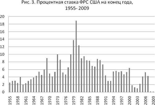 Насыщение мирового рынка долларами стимулировалось эффективным регулированием ставки рефинансирования ФРС. Динамический характер процесса очевиден – реакция рынка наступает с запаздыванием и изменения регулирующей ставки проводились волнообразно, в несколько фаз. Очевидно также, что нынешний кризис не был неожиданностью для регуляторов – процентную ставку в 2001-2003 годах уже некуда было снижать, что говорило о приближении к границам физической ёмкости рынка – в условиях доступности доллара, приближающейся к абсолютной, становилось попросту некуда инвестировать. Чтобы избежать, осознанно ли или инстинктивно, мы пока не знаем, жёсткой посадки на дно, ФРС еще в 2004 году начала постепенно поднимать ставки после длительного периода их постепенного снижения (рис.3).