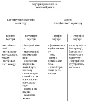 Мірою приступності закордонних ринків може служити склад і твердість торгових бар'єрів. Під вхідними бар'єрами, звичайно, розуміються будь-які міри правового, організаційного, технічного, економічного, фінансового та ін. характеру труднощі, що створюють, для входу на товарний ринок. Основні види торгових бар'єрів наведено на рис. 1.