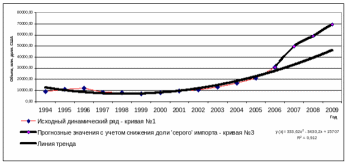 Третий динамический ряд (2006, 2007, 2008, 2009 гг.) соответствует экспертной оценке роста объема импорта в стоимостном выражении с учетом внедрения системы электронного документооборота с иностранными партнерами (кривая №3). График кривой№3 построен, исходя из следующих предельных условий:
