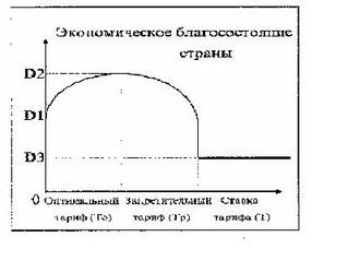 При отсутствии тарифа (Т=0) экономическое благосостояние большой страны находится на уровне D1. Максимальное положительное воздействие тарифа на экономическое благосостояние достигается при оптимальном уровне тарифа То, при котором за счёт превышения выигрыша от улучшения условий торговли над потерями от введения тарифа экономическое благосостояние возрастает до уровня D2. Затем, по мере увеличения ставки тарифа, экономические потери начинают всё более перекрывать получаемый выигрыш до тех пор, пока уровень тарифа не станет настолько высоким или запретительным (Тр), что импорт товара в страну потеряет экономический смысл. Из-за отсутствия более дешёвого импорта экономическое благосостояние страны упадёт на уровень D3. Дальнейшее увеличение ставки тарифа уже никак не сможет сказаться на экономическом благосостоянии, поскольку импорта просто не будет.