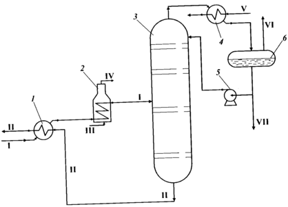 Стабилизация нефти на промыслах: 1 — теплообменник; 2 — печь; 3 —ректификационная колонна; 4 — холодильник; 5 — насос; 6 — емкость; I —нефть сырая; II — стабильная нефть; III — топливный газ; IV — дымовые газы;V — вода; VI — газ стабилизации; VII — ШФЛУ