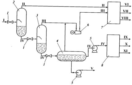 Сырая нефть I из пласта проходит дроссельный вентиль 1 и поступает в сепаратор первой ступени 2, давление в сепараторе поддерживается на уровне 0,6—0,7 МПа, которое достаточно для бескомпрессорной подачи газа II на ГПЗ. Далее из сепаратора первой ступени 2 через дроссельный вентиль нефть подается в сепаратор второй ступени 3, где за счет дальнейшего снижения давления выделяется оставшийся газ III. Далее нефть перетекает в отстойник 4, где от нее отделяется пластовая вода V и оставшийся газ. Давление в сепараторе второй ступени 0,2—0,3 МПа. В отстойнике давление близко к атмосферному. Газы из сепаратора второй ступени и отстойника сжимаются компрессором 6 и подаются на газоперерабатывающий завод.