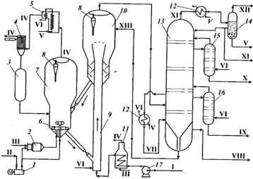 Сырье I после гидроочистки подогревается в печи 11 и поступает к основа-нию лифта-реактора 9. Температура в реакторе 515—545 °С, время контакта сырья с катализатором несколько секунд. Сюда же из регенератора 7 ссыпается регенерированный катализатор и в низ реактора подается водяной пар VI. Катализатор, взвешенный в смеси паров сырья и водяного пара, через решетку на конце лифта-реактора 9 попадает в отпарную секцию 10. Там пары продуктов крекинга отделяются от катализатора, который ссыпается вниз отпарной секции. Для повышения эффективности отпаривания нижняя часть отпарной секции снабжена перегородками. Отпаренный катализатор самотеком поступает в регенератор 7. Воздух II на регенерацию подают компрессором 1; температура регенерации 700 °С, давление 2,5 МПа, интенсивность выжигания кокса примерно 80 кг/ч, скорость газов над слоем катализатора 0,9—1,0 м/с. В регенераторе отсутствуют паровые змеевики для отвода избыточного тепла, и тепловой баланс реакторного блока регулируют, изменяя количество воздуха II, подаваемого через распределительное устройство 6. Дымовые газы и воздух подаются в регенератор раздельно, что позволяет регулировать скорость регенерации катализатора.