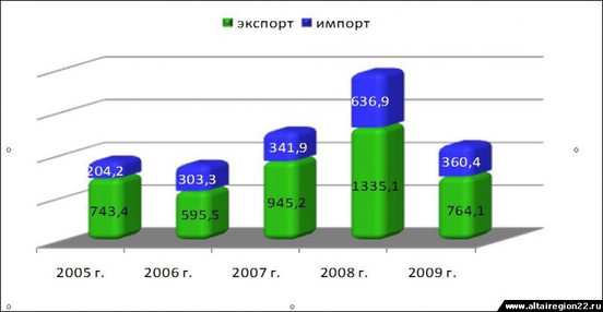 Товарооборот со странами дальнего зарубежья при экспорте сократился по сравнению с аналогичным периодом прошлого года в 2,5 раза (на 145 115,8 тыс. долларов США), в то же время при импорте, напротив, увеличился – в 2,5 раза (на 71 622,9 тыс. долларов США). В целом снижение внешнеторгового оборота Алтайского края со странами дальнего зарубежья по сравнению с аналогичным периодом 2009 года составило 25,7% (73 492,9 тыс. долларов США).