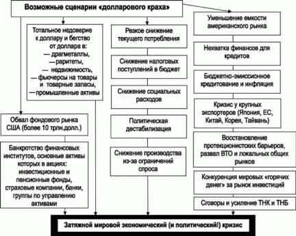 Поскольку "схлопнется" самый емкий американский рынок, вслед за этим (вспомним огромное положительное сальдо торгового баланса целого ряда стран с Америкой) начнется кризис сбыта у крупных экспортеров: Японии, ЕС, Китая, Кореи, Тайваня. Это будет означать неизбежность восстановления протекционистских барьеров между национальными рынками, то есть, по сути, ликвидацию самой парадигмы свободной мировой торговли. Последует крах и развал — юридический или фактический — Всемирной торговой организации ВТО (в которую Россия сейчас так старается поскорее вступить) и локальных общих рынков, и начнется острая конкуренция мировых "горячих денег" за рынок инвестиций.