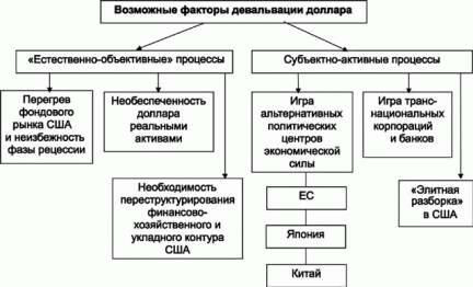 Теперь попытаемся рассмотреть, из-за чего же может быть девальвирован (или, тем более, может рухнуть) доллар? Каковы факторы, которые на это влияют? Сначала мы их просто сгруппируем и перечислим (см. рис.4), а затем перейдем к более детальному рассмотрению.