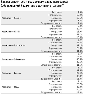 Население Казахстана считает объединение с Россией наиболее положительным для государства. Это можно увидеть в данных социального опроса в Казахстане. Таковы данные опроса 1200 респондентов в шести регионах Казахстана: Акмолинской, Южно-Казахстанской, Западно-Казахстанской, Восточно-Казахстанской, Карагандинской областях и Алматы, проведенного в 2009 году Казахстанским институтом социально-экономической информации и прогнозирования (КИСЭИП).